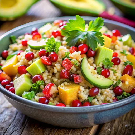 Frissítő saláta lédús paradicsommal, zamatos avokádóval és fehérjedús quinoával, citromos dresszinggel.